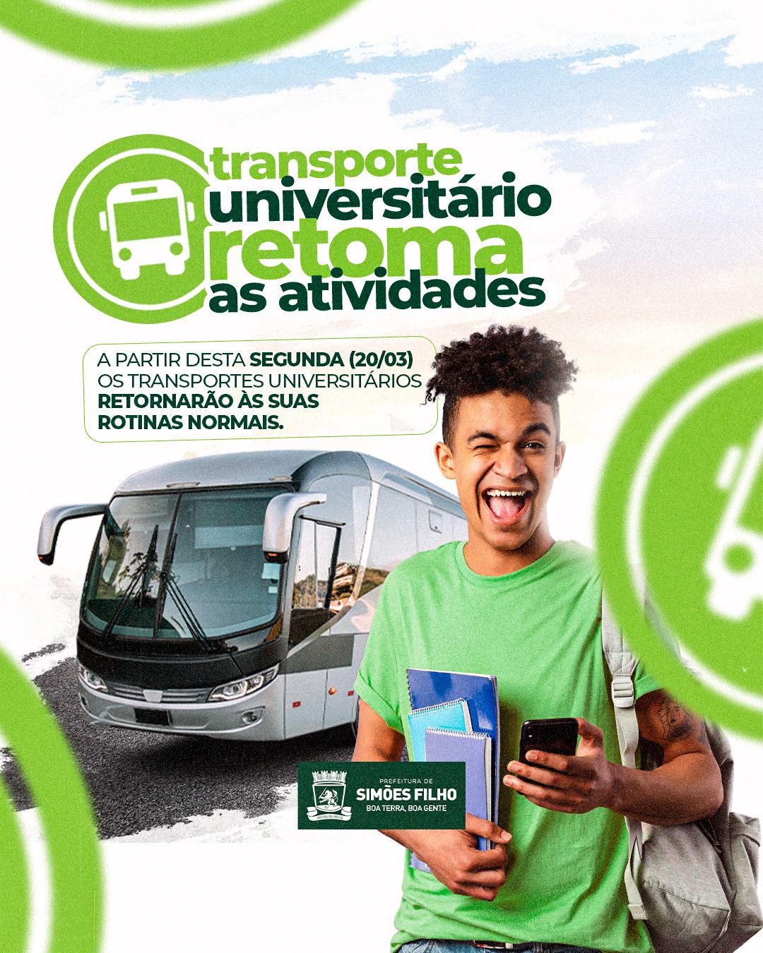 A Prefeitura de Simões Filho, por meio da Secretaria de Educação (Semed), comunica aos estudantes do ensino técnico e universitário, que estudam em Salvador e demais Cidades da Região Metropolitana, que os transportes que realizam o transbordo para as Unidades de Ensino estarão à disposição nesta segunda-feira (20).