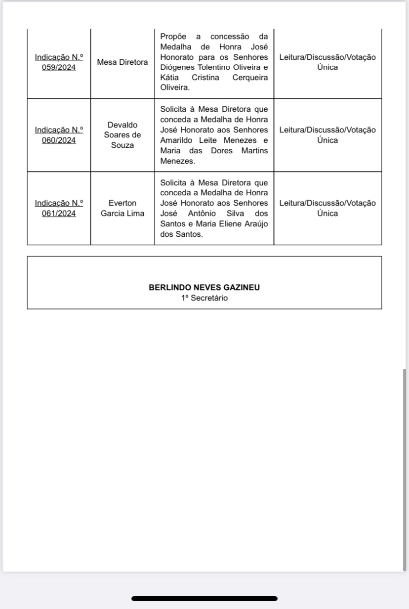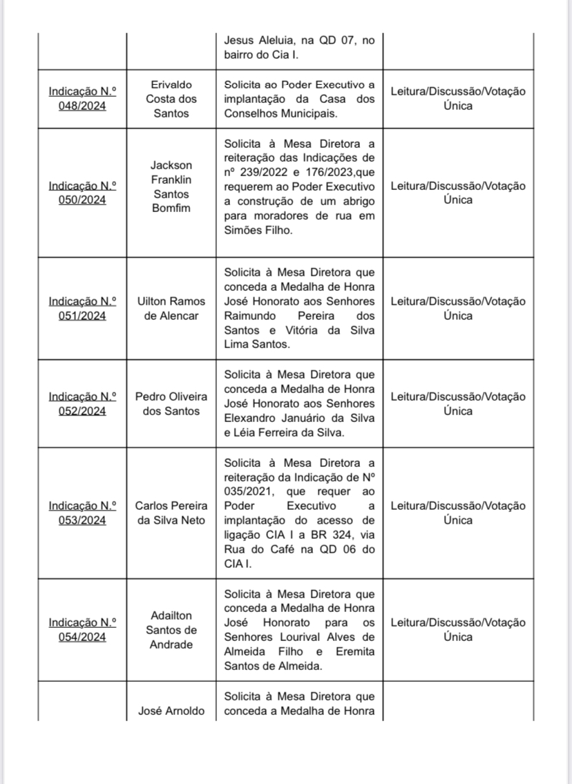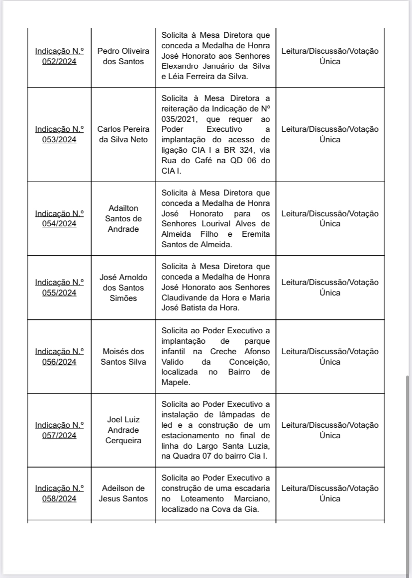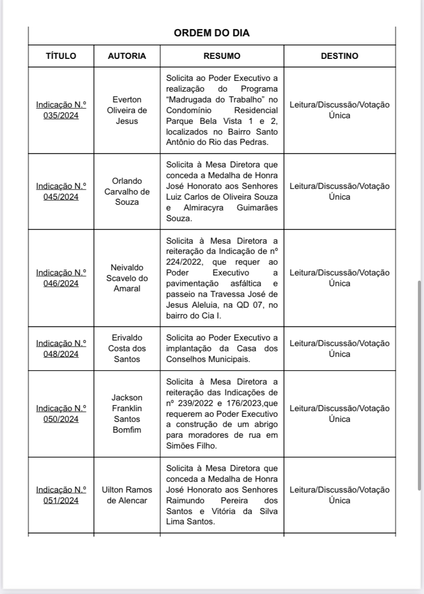 Às 9h desta terça-feira (16), na 6ª Sessão Ordinária, Câmara vota indicações de autoria de Adailton Caçambeiro (UNIÃO), Carlos Neto (PSDB/Cidadania), Del Capoeira (PRD), Del (UNIÃO), Eri Costa(PL), Everton das placas (UNIÃO), Everton Paim (PL), Jackson Bomfim (PMN), Joel Cerqueira (PDT), Arnoldo Simões (REPUBLICANOS), Mesa Diretora, Moisés Santos (PRD), Neivaldo Scavelo (PRD), Orlando de Amadeu (PSDB/Cidadania), Pedro da Kombi (PDT), Itu’s Ramos (PSDB/Cidadania).