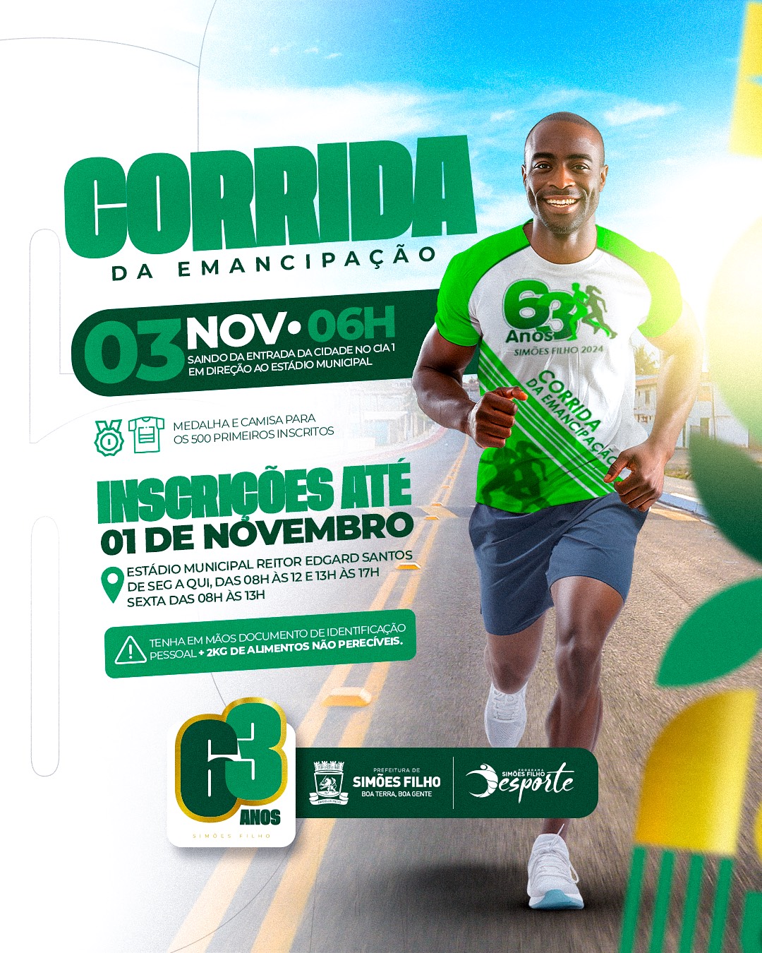 A Prefeitura de Simões Filho, por meio da Secretaria de Esporte, Lazer e Juventude (Sejuv), convida a população para participar de mais uma edição da tradicional Corrida da Emancipação, em celebração aos 63 anos de emancipação da cidade. O evento acontecerá no dia 3 de novembro, a partir das 6h, e promete ser uma grande festa do esporte, saúde e integração comunitária.