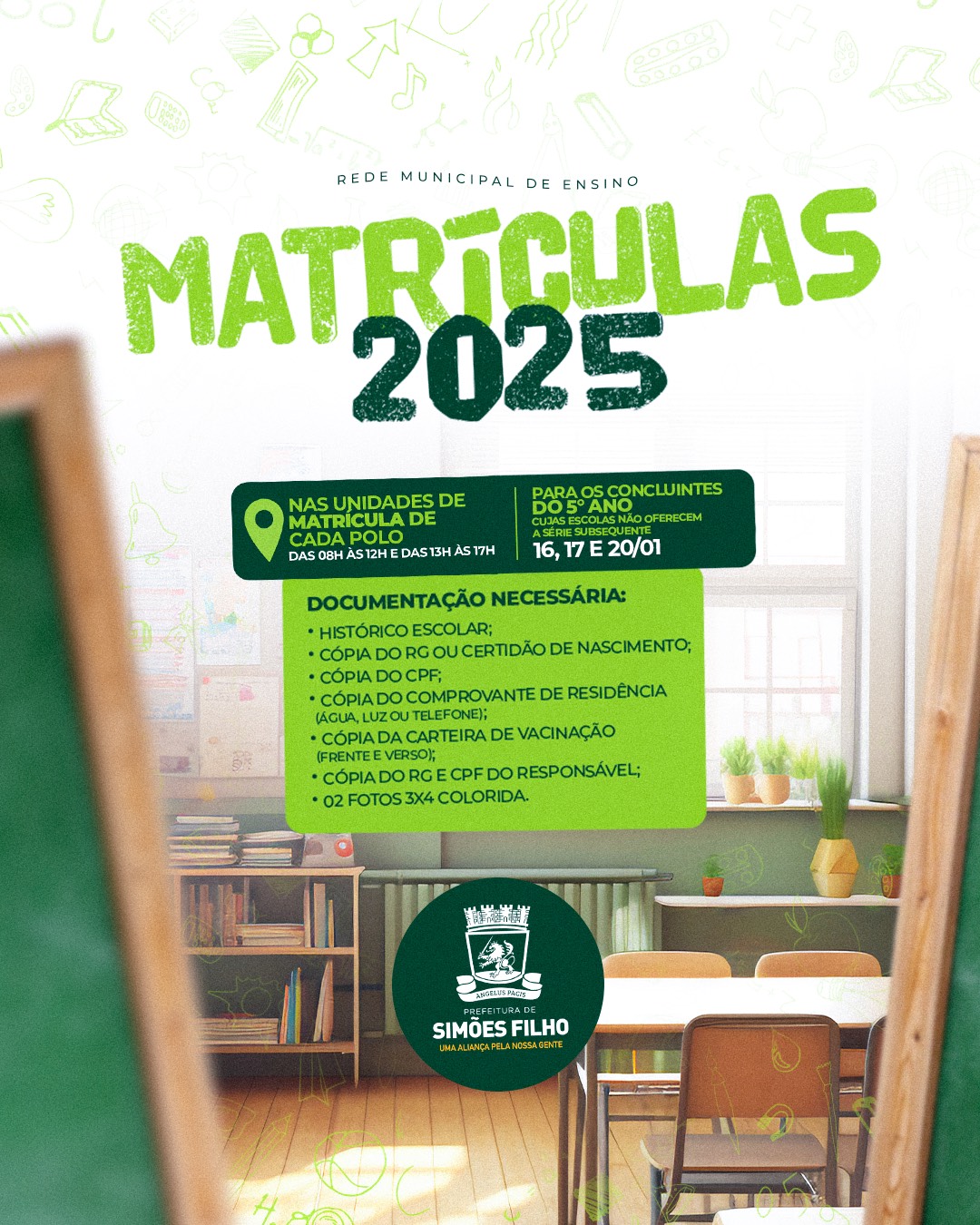 A Prefeitura de Simões Filho, por meio da Secretaria Municipal de Educação, segue com o cronograma das Matrículas 2025 para a Rede Municipal de Ensino. Nos dias 16, 17 e 20 de janeiro, as Unidades de Matrícula estarão abertas para atender as famílias dos alunos concluintes do 5º ano, cujas escolas não oferecem a série subsequente.