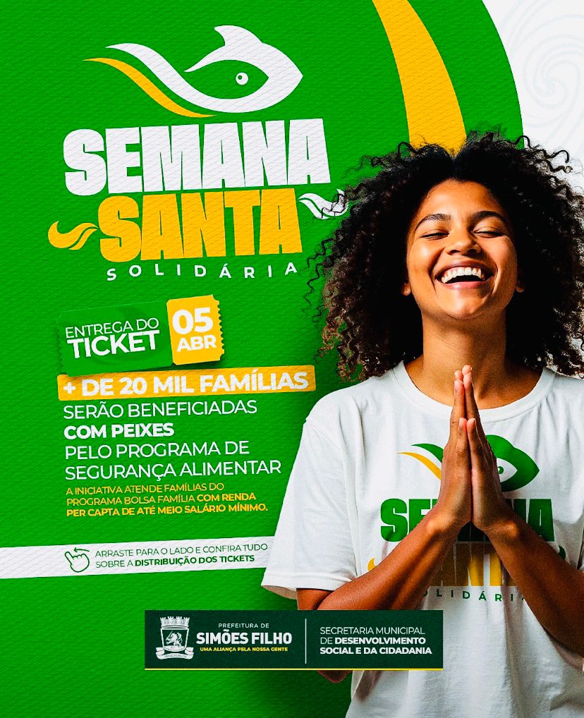 A Prefeitura de Simões Filho, por meio da Secretaria Municipal de Desenvolvimento Social e da Cidadania, realiza mais uma edição da Semana Santa Solidária, garantindo a entrega de peixes para famílias em situação de vulnerabilidade social. A iniciativa faz parte do Programa de Segurança Alimentar e beneficiará mais de 20 mil famílias no município.