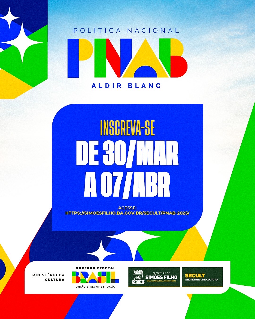 As inscrições já estão abertas e seguem até o dia 07 de abril(hoje). Os interessados devem acompanhar as redes oficiais da Prefeitura para obter mais informações sobre prazos, critérios de seleção e documentos necessários para a inscrição. Todos os detalhes estão disponíveis no link: [http://simoesfilho.ba.gov.br/secult/pnab-2025/](http://simoesfilho.ba.gov.br/secult/pnab-2025/)