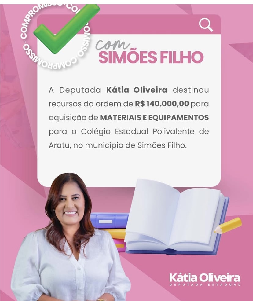 Mais um grande investimento chegou para Simões Filho, graças ao trabalho incansável da deputada estadual Kátia Oliveira. A parlamentar destinou R$ 140 mil em emendas impositivas para a aquisição de materiais e equipamentos para o Colégio Estadual Polivalente de Aratu, uma das instituições de ensino mais tradicionais da cidade.