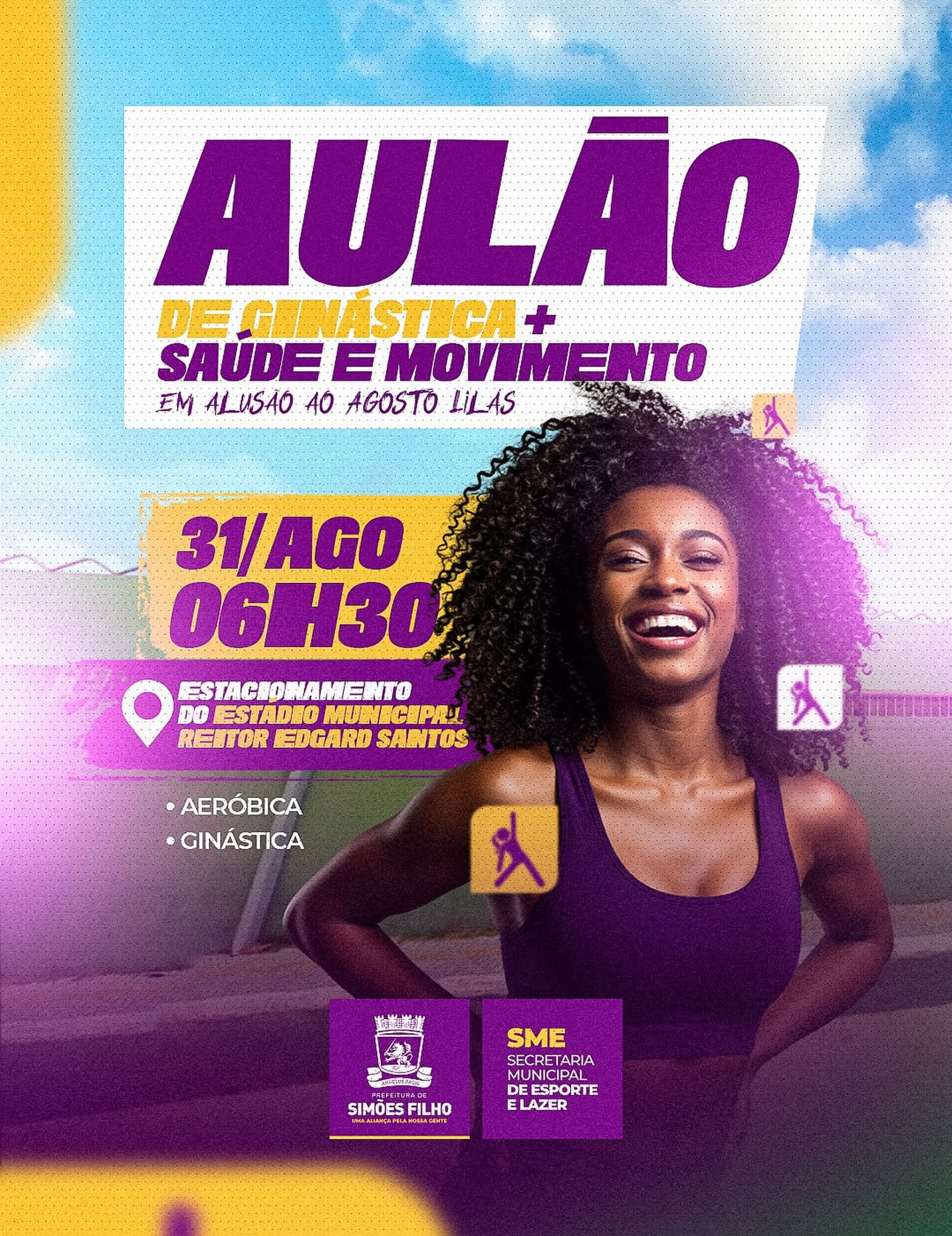 A Prefeitura de Simões Filho, por meio da Secretaria de Esporte e Lazer (SME), realiza no próximo domingo (31) o Aulão Saúde e Movimento, em alusão à campanha Agosto Lilás, mês dedicado à conscientização e ao enfrentamento da violência contra a mulher. A atividade acontece a partir das 6h30, no estacionamento do Estádio Municipal Reitor Edgard Santos.