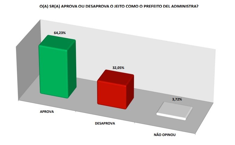 Entre as avaliações, 12,05% consideram a gestão ótima, 39,10% boa, 20,51% regular, 11,67% ruim e 14,10% péssima. A pesquisa tem margem de erro de 3,5 pontos percentuais e intervalo de confiança de 95%.
