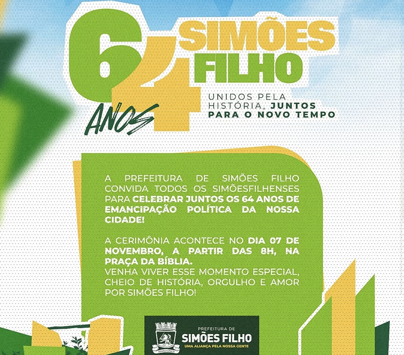 Com o tema “Simões Filho – 64 anos: unidos pela história, juntos para o novo tempo”, o aniversário da cidade simboliza a comemoração de suas conquistas, a esperança e o compromisso com um futuro de com ainda mais desenvolvimento, inclusão e qualidade de vida para todos.