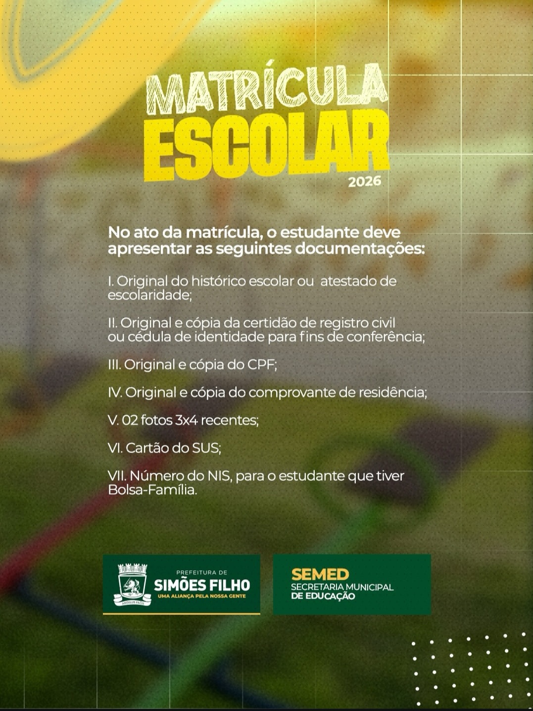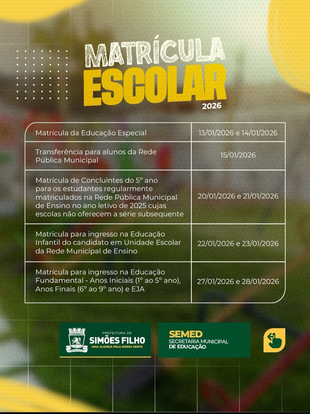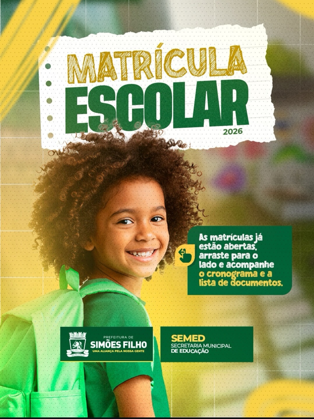 A Prefeitura de Simões Filho, por meio da Secretaria Municipal de Educação (SEMED), divulgou o cronograma oficial das matrículas escolares da Rede Pública Municipal de Ensino para o ano letivo de 2026. O processo será realizado de forma organizada, com atendimento em polos definidos, garantindo mais conforto, agilidade e organização para pais e responsáveis.