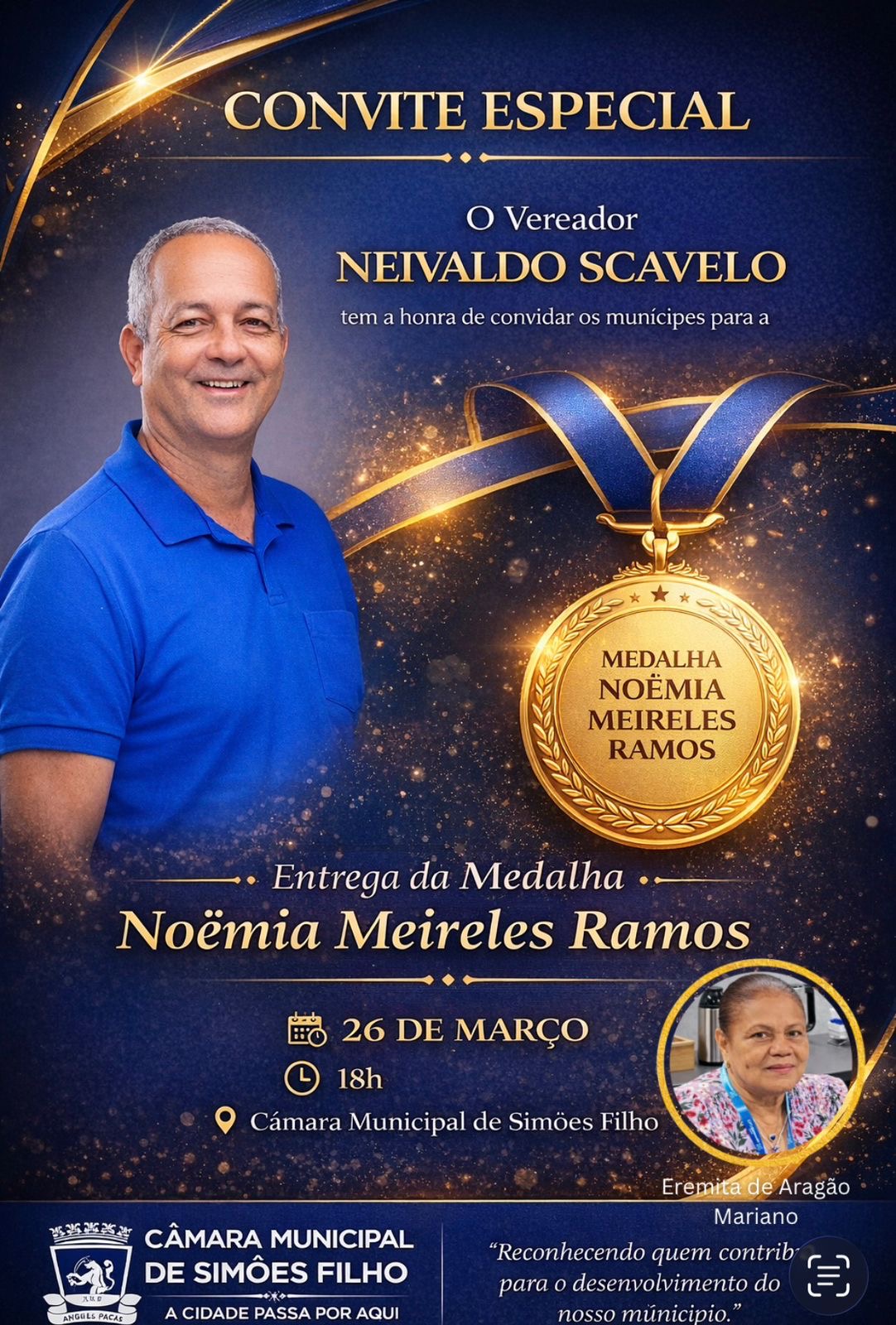 O vereador Neivaldo Scavelo será um dos parlamentares que participarão da Sessão Solene de entrega da Medalha Noêmia Meireles Ramos, marcada para o dia 26 de março, às 18h, na Câmara Municipal de Simões Filho.