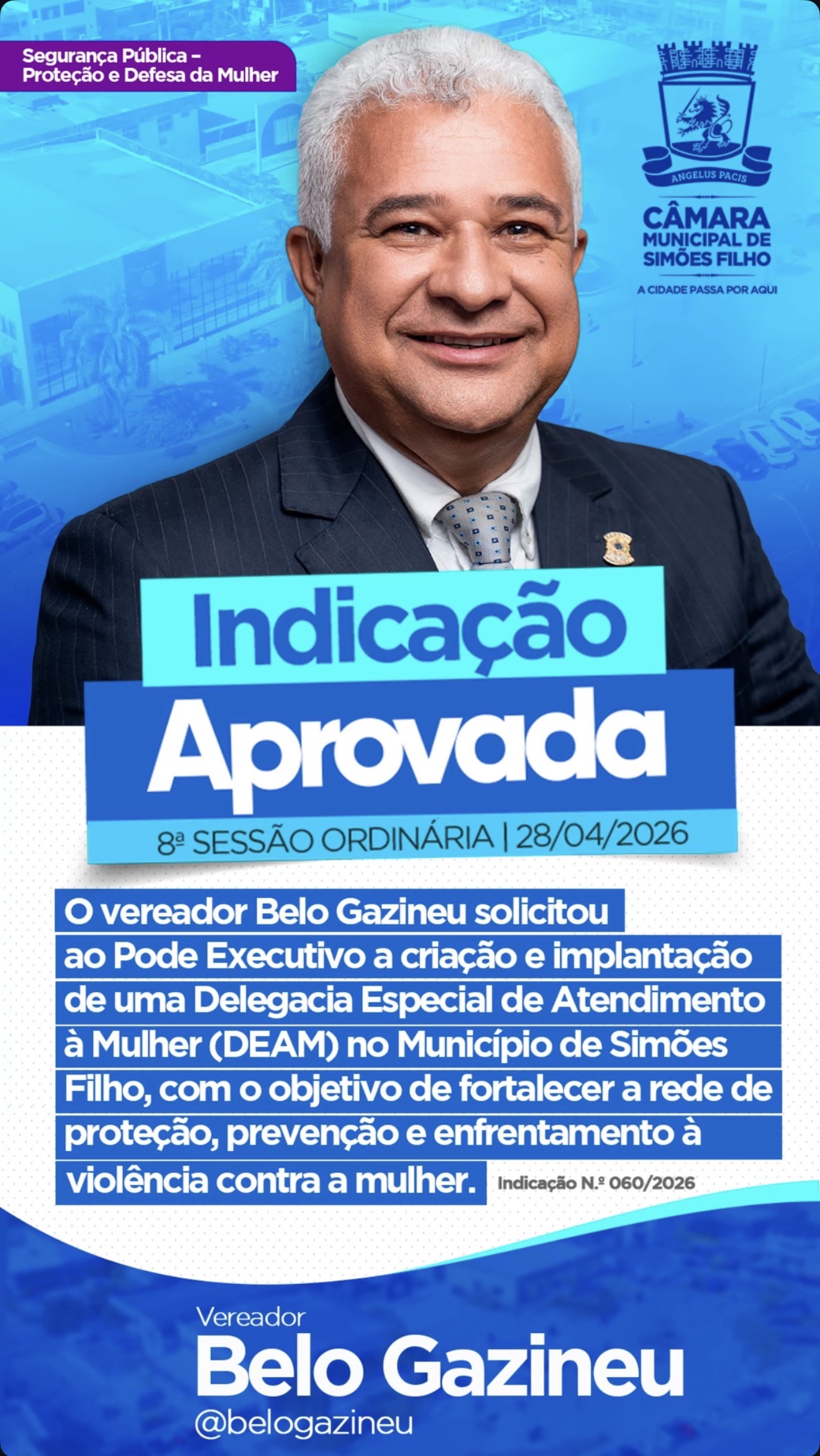 Durante a 8ª Sessão Ordinária da Câmara Municipal de Simões Filho, realizada nesta terça-feira (28), o vereador Belo Gazineu teve aprovada a Indicação nº 060/2026, que solicita ao Poder Executivo a criação e implantação de uma Delegacia Especial de Atendimento à Mulher (DEAM) no município.
